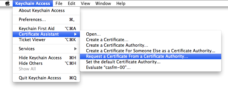 Time to request your certificate. Open Spotlight and enter Keychain. Create a new certificate request.
