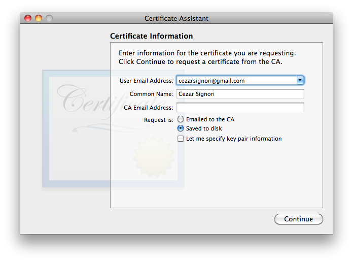 Once your are done, go back to the iOS Provisioning Portal and click on Certificates. Then click on “Request a Certificate”, that in your case should be where you can see the “Download” button.