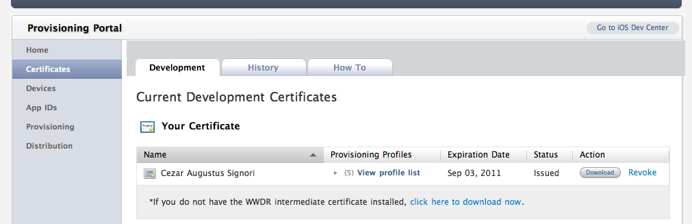 Now, download the provisioning profile you just created and go back to the certificates section, to download your certificate.