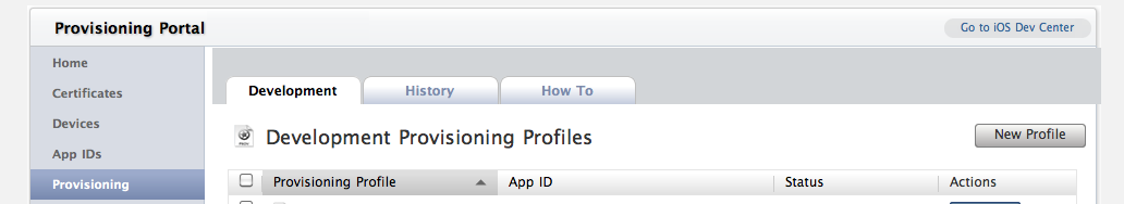 I know, I know… but we are almost in the end of the process. Now it is time to create the Provisioning Profile, so go to the Provisioning screen and tap on “New Profile”.